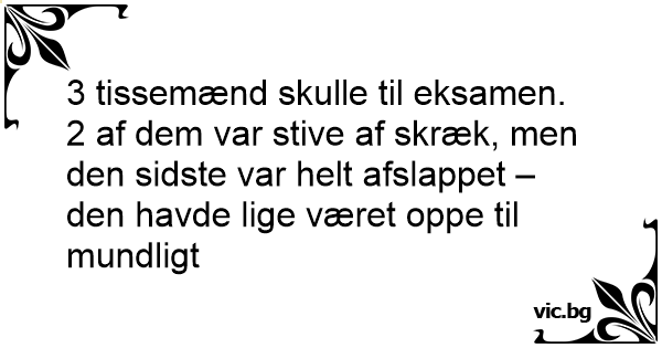 3 tissemænd skulle til eksamen. 2 af dem var stive af skræk, men den sidste var helt afslappet – den havde lige været oppe til mundligt