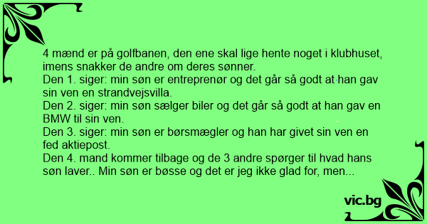 Den 4. mand kommer tilbage og de 3 andre spørger til hvad hans søn laver.. Min søn er bøsse og det er jeg ikke glad for, men han må være god for han fik både en strandvejsvilla, en BMW og en fed aktiepost af sine tre sidste kærester!