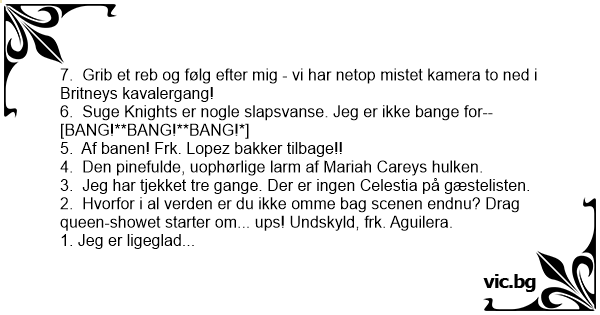 2. Hvorfor i al verden er du ikke omme bag scenen endnu? Drag queen-showet starter om... ups! Undskyld, frk. Aguilera.