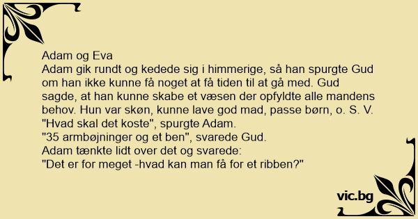 Efter næsten en evighed i paradisets have, råbte Adam en dag til Gud. - Herre jeg har et problem. - Hvad er dit problem spurgte Gud. - Jo Herre, - jeg ved at du har skabt mig og lader mig bo i...