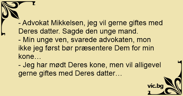 - Advokat Mikkelsen, jeg vil gerne giftes med Deres datter. Sagde den unge mand.
