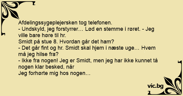 - Det går fint og hr. Smidt skal hjem i næste uge… Hvem må jeg hilse fra?
