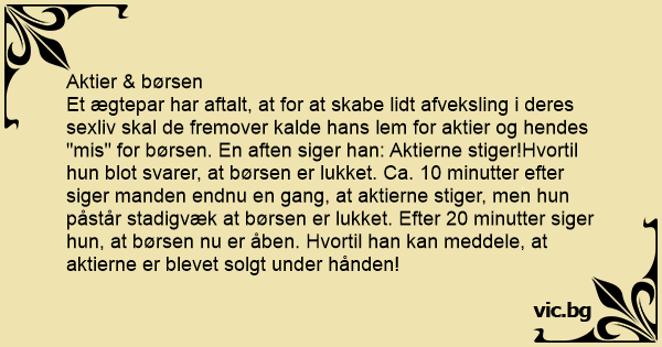 Et ægtepar har aftalt, at for at skabe lidt afveksling i deres sexliv skal de fremover kalde hans lem for aktier og hendes "mis" for børsen. En aften siger han: Aktierne stiger!Hvortil hun blot svarer, at børsen er lukket. Ca. 10 minutter efter siger manden endnu en gang, at aktierne stiger, men hun påstår stadigvæk at børsen er lukket. Efter 20 minutter siger hun, at børsen nu er åben. Hvortil han kan meddele, at aktierne er blevet solgt under hånden!