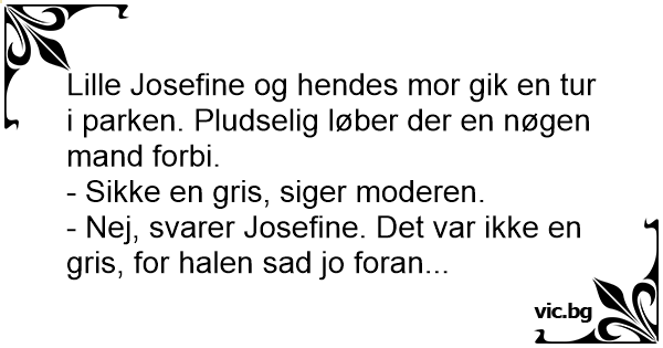 - Nej, svarer Josefine. Det var ikke en gris, for halen sad jo foran...