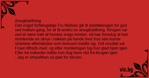 Den noget forfængelige Fru Nielsen gik til plastikkirugen for gud ved hvilken gang, for at få endnu en ansigtsløftning. Kirugen var ved at være træt af hendes evige renden, så han foreslog at han monterede en skrue i nakken på hende hvor hun selv kunne stramme efterhånden som behovet meldte sig. Det resultat var Fruen tilfreds med, og efter monteringen tog hun glad hjem igen.