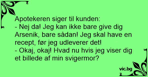 Manden på apoteket: - Jeg vil gerne have lidt arsenik til min svigermor. - Har de recept? - Nej, men jeg har et billede