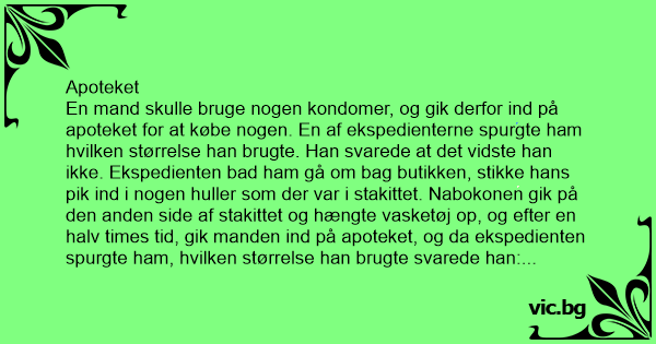 En mand skulle bruge nogen kondomer, og gik derfor ind på apoteket for at købe nogen. En af ekspedienterne spurgte ham hvilken størrelse han brugte. Han svarede at det vidste han ikke. Ekspedienten bad ham gå om bag butikken, stikke hans pik ind i nogen huller som der var i stakittet. Nabokonen gik på den anden side af stakittet og hængte vasketøj op, og efter en halv times tid, gik manden ind på apoteket, og da ekspedienten spurgte ham, hvilken størrelse han brugte svarede han: Skidt med kondomerne, hvad koster stakittet