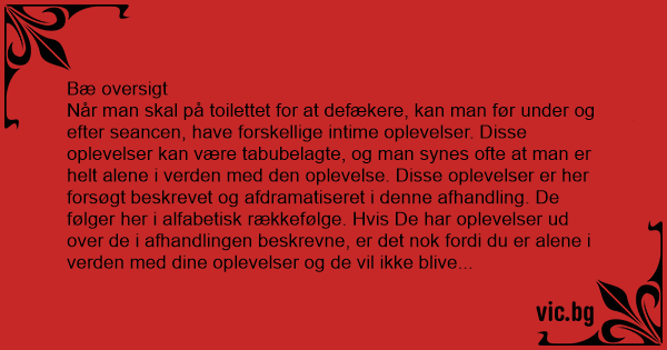 Når man skal på toilettet for at defækere, kan man før under og efter seancen, have forskellige intime oplevelser. Disse oplevelser kan være tabubelagte, og man synes ofte at man er helt alene i verden med den oplevelse. Disse oplevelser er her forsøgt beskrevet og afdramatiseret i denne afhandling. De følger her i alfabetisk rækkefølge. Hvis De har oplevelser ud over de i afhandlingen beskrevne, er det nok fordi du er alene i verden med dine oplevelser og de vil ikke blive tilføjet.