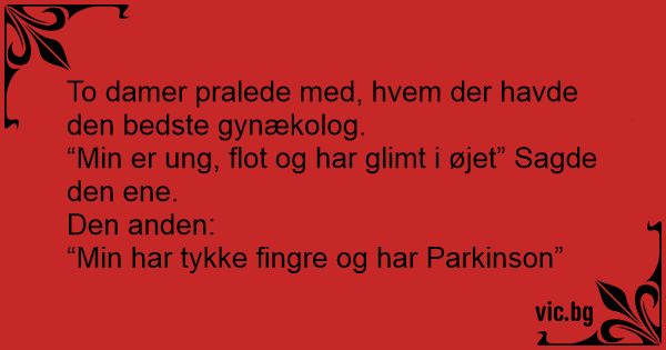 To damer sidder og taler om deres gynækologer: Den ene: "min er høj, flot og har et glimt i øjet" Den anden: "min har to fingre og Parkinson"