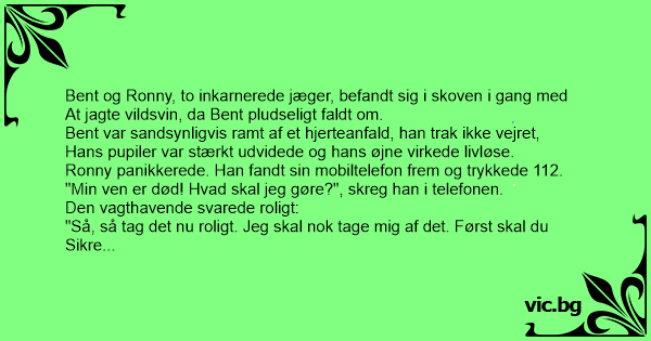 2 jagers lopen in het bos en plotseling valt er een op de grond en zijn ogen word doffig en rollen achter in zijn kassen. Dus die andere jager grijpt zijn mobiel en belt 112 en zegt ''MIJN VRIEND...