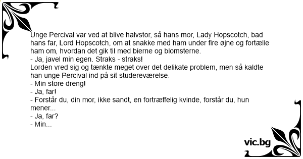 Grevinnan till greven. - Det är dags att du talar med vår son om det här med blommor och bin. Han är snart vuxen. Greven suckade och gick in till sonen i hans rum. - Min pojke, kommer du ihåg när...