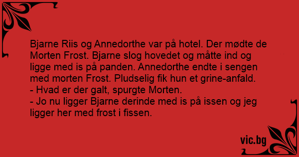 Bjarne Riis og Annedorthe var på hotel. Der mødte de Morten Frost. Bjarne slog hovedet og måtte ind og ligge med is på panden. Annedorthe endte i sengen med morten Frost. Pludselig fik hun et grine-anfald.