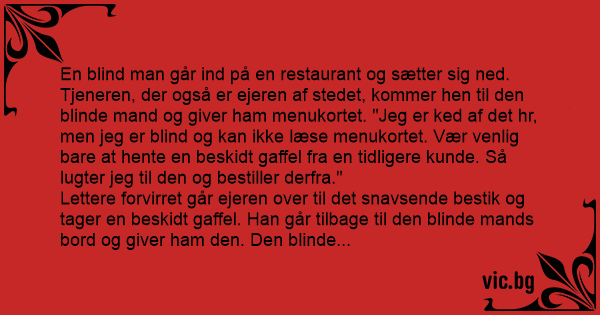En blind man går ind på en restaurant og sætter sig ned. Tjeneren, der også er ejeren af stedet, kommer hen til den blinde mand og giver ham menukortet. "Jeg er ked af det hr, men jeg er blind og kan ikke læse menukortet. Vær venlig bare at hente en beskidt gaffel fra en tidligere kunde. Så lugter jeg til den og bestiller derfra."