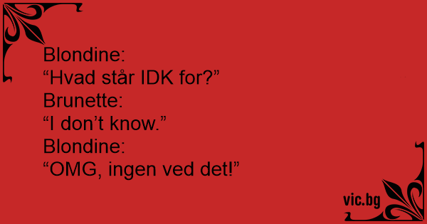 Blondine:<br />“Hvad står IDK for?”<br />Brunette:<br />“I don’t know.”<br />Blondine:<br />“ОМG, ingen ved det!”