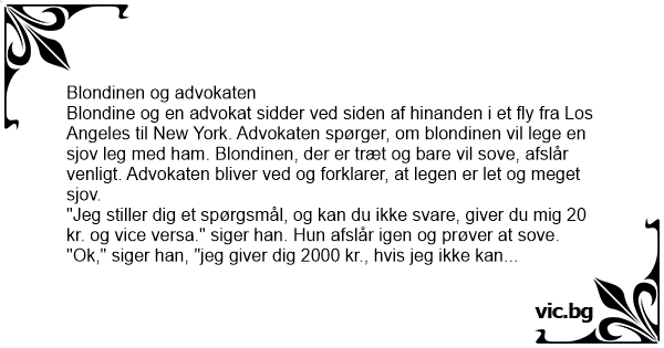 En blondin och en advokat sitter bredvid varandra på flyget mellan Stockholm och Köpenhamn. Advokaten frågar om hon har lust att leka en kul lek? Blondinen som är trött och vill ta sig en tupplur,...