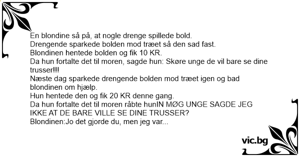 Blondinen:Jo det gjorde du, men jeg var sikker på at de ikke så mine trusser denne gang, for jeg tog dem af først.