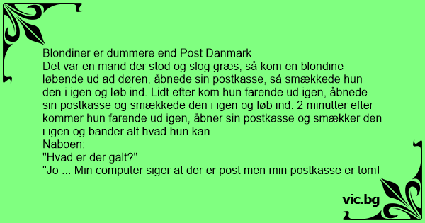 Det var en mand der stod og slog græs, så kom en blondine løbende ud ad døren, åbnede sin postkasse, så smækkede hun den i igen og løb ind. Lidt efter kom hun farende ud igen, åbnede sin postkasse og smækkede den i igen og løb ind. 2 minutter efter kommer hun farende ud igen, åbner sin postkasse og smækker den i igen og bander alt hvad hun kan.