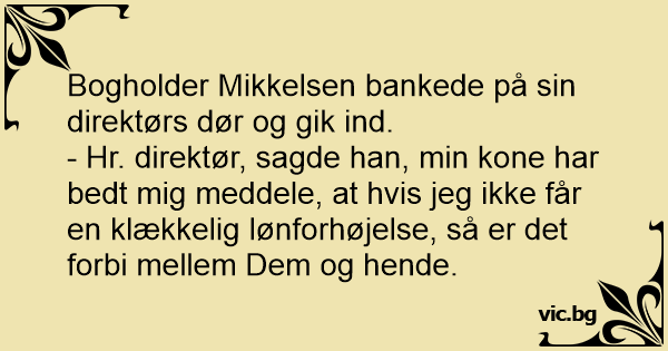 - Hr. direktør, sagde han, min kone har bedt mig meddele, at hvis jeg ikke får en klækkelig lønforhøjelse, så er det forbi mellem Dem og hende.