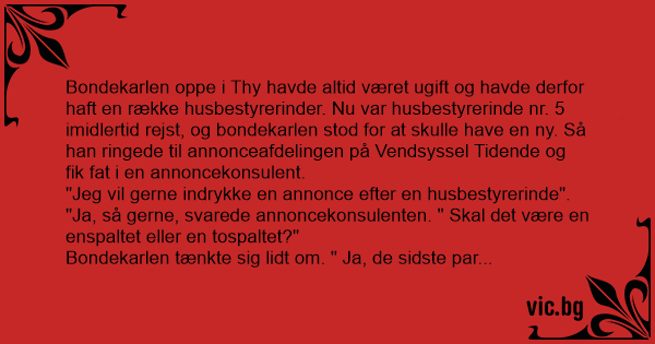 Bondekarlen oppe i Thy havde altid været ugift og havde derfor haft en række husbestyrerinder. Nu var husbestyrerinde nr. 5 imidlertid rejst, og bondekarlen stod for at skulle have en ny. Så han ringede til annonceafdelingen på Vendsyssel Tidende og fik fат i en annoncekonsulent.