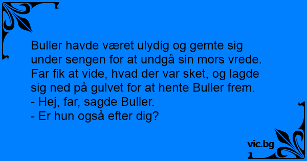 Buller havde været ulydig og gemte sig under sengen for at undgå sin mors vrede. Far fik at vide, hvad der var sket, og lagde sig ned på gulvet for at hente Buller frem.