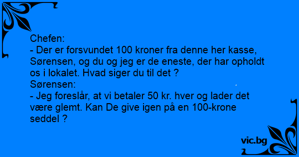 - Der er forsvundet 100 kroner fra denne her kasse, Sørensen, og du og jeg er de eneste, der har opholdt os i lokalet. Hvad siger du til det ?