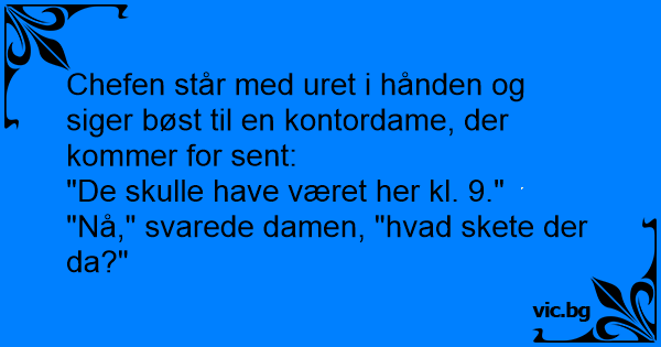 Chefen står med uret i hånden og siger bøst til en kontordame, der kommer for sent: