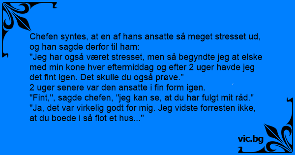 "Jeg har også været stresset, men så begyndte jeg at elske med min kone hver eftermiddag og efter 2 uger havde jeg det fint igen. Det skulle du også prøve."