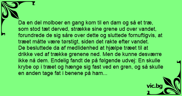 Da en del molboer en gang kom til en dam og så et træ, som stod tæt derved, strække sine grene ud over vandet, forundrede de sig såre over dette og sluttede fornuftigvis, at træet måtte være tørstigt, siden det rakte efter vandet.