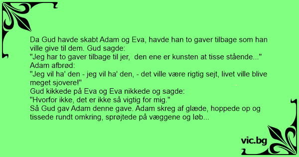 Så Gud gav Adam denne gave. Adam skreg af glæde, hoppede op og tissede rundt omkring, sprøjtede på væggene og løb ned til stranden