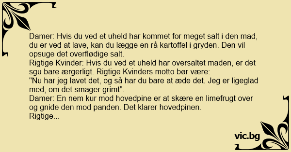 Damer: Hvis du ved et uheld har kommet for meget salt i den mad, du er ved at lave, kan du lægge en rå kartoffel i gryden. Den vil opsuge det overflødige salt.