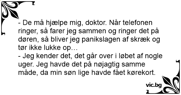- De må hjælpe mig, doktor. Når telefonen ringer, så farer jeg sammen og ringer det på døren, så bliver jeg panikslagen af skræk og tør ikke lukke op…