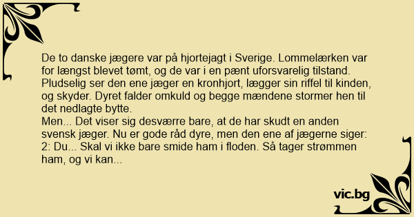 De to danske jægere var på hjortejagt i Sverige. Lommelærken var for længst blevet tømt, og de var i en pænt uforsvarelig tilstand. Pludselig ser den ene jæger en kronhjort, lægger sin riffel til kinden, og skyder. Dyret falder omkuld og begge mændene stormer hen til det nedlagte bytte.