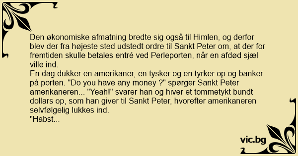 En dag dukker en amerikaner, en tysker og en tyrker op og banker på porten. "Do you have any money ?" spørger Sankt Peter amerikaneren... "Yeah!" svarer han og hiver et tommetykt bundt dollars op, som han giver til Sankt Peter, hvorefter amerikaneren selvfølgelig lukkes ind.