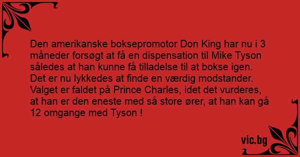 Det er nu lykkedes at finde en værdig modstander. Valget er faldet på Prince Charles, idet det vurderes, at han er den eneste med så store ører, at han kan gå 12 omgange med Tyson !