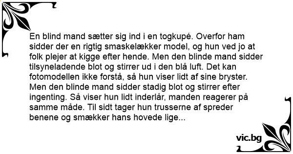 En blind mand sætter sig ind i en togkupé. Overfor ham sidder der en rigtig smaskelækker model, og hun ved jo at folk plejer at kigge efter hende. Men den blinde mand sidder tilsyneladende blot og stirrer ud i den blå luft. Det kan fotomodellen ikke forstå, så hun viser lidt af sine bryster. Men den blinde mand sidder stadig blot og stirrer efter ingenting. Så viser hun lidt inderlår, manden reagerer på samme måde. Til sidt tager hun trusserne af spreder benene og smækker hans hovede lige imellem dem. Hvortil han svarer -- Esbjerg, det er her jeg skal af!!!!