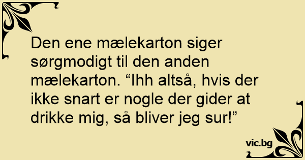 Den ene mælekarton siger sørgmodigt til den anden mælekarton. “Ihh altså, hvis der ikke snart er nogle der gider at drikke mig, så bliver jeg sur!”