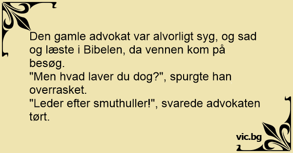 Den gamle advokat var meget syg, og da en ven besøgte ham på hospitalet, lå han og læste i Bibelen. - Hvad laver du ? spurgte vennen. - Leder efter smuthuller, svarede advokaten.