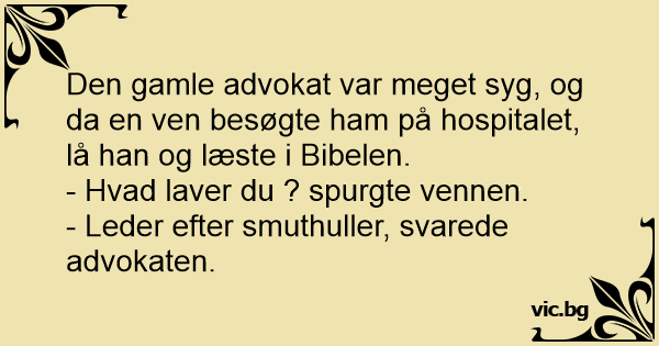 Den gamle advokat var alvorligt syg, og sad og læste i Bibelen, da vennen kom på besøg. "Men hvad laver du dog?", spurgte han overrasket. "Leder efter smuthuller!", svarede advokaten tørt.