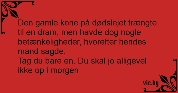 Den gamle kone på dødslejet trængte til en dram, men havde dog nogle betænkeligheder, hvorefter hendes mand sagde: