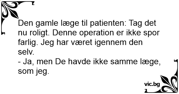 Den gamle læge til patienten: Tag det nu roligt. Denne operation er ikke spor farlig. Jeg har været igennem den selv.