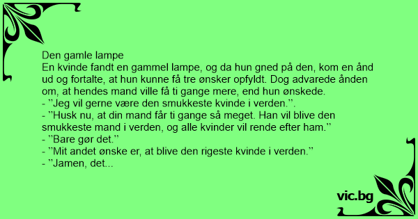 En kvinde fandt en gammel lampe, og da hun gned på den, kom en ånd ud og fortalte, at hun kunne få tre ønsker opfyldt. Dog advarede ånden om, at hendes mand ville få ti gange mere, end hun ønskede.