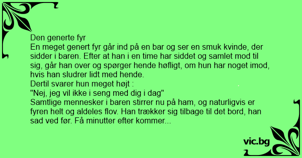 En meget genert fyr går ind på en bar og ser en smuk kvinde, der sidder i baren. Efter at han i en time har siddet og samlet mod til sig, går han over og spørger hende høfligt, om hun har noget imod, hvis han sludrer lidt med hende.