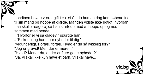 Londinen havde været gift i ca. et år, da hun en dag kom løbene ind til sin mand og hoppe af glæde. Manden vidste ikke rigtigt, hvordan han skulle reagere, så han startede med at hoppe op og ned sammen med hende.