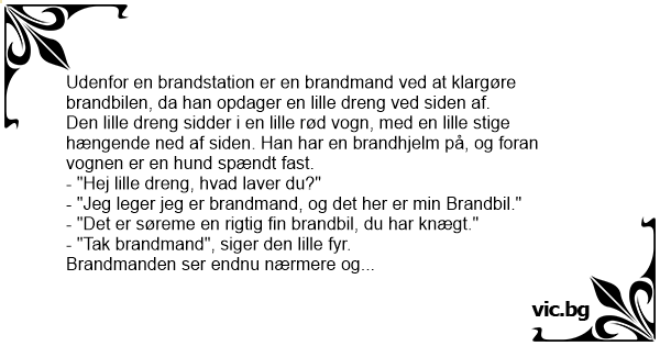 - "Knægt" siger brandmanden, "jeg vil ikke fortælle dig, hvordan du skal kører din brandbil, men hvis du bandt vognen fast om hundens hals, tror jeg på, at det ville gå meget stærkere."