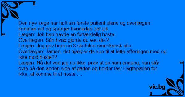 Lægen: Nå det ved jeg nu ikke, prøv at se ham engang, han står ovre på den anden side af gaden og holder fast i lygtepælen for ikke, at komme til at hoste.....