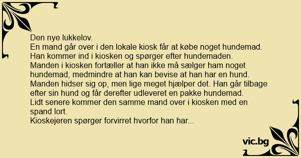 En mand går over i den lokale kiosk får at købe noget hundemad. Han kommer ind i kiosken og spørger efter hundemaden.