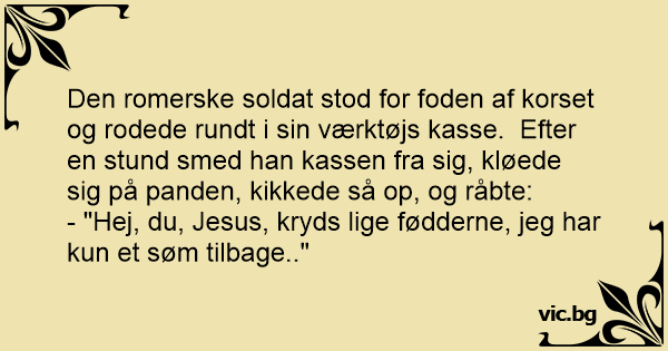Den romerske soldat stod for foden af korset og rodede rundt i sin værktøjs kasse. Efter en stund smed han kassen fra sig, kløede sig på panden, kikkede så op, og råbte: