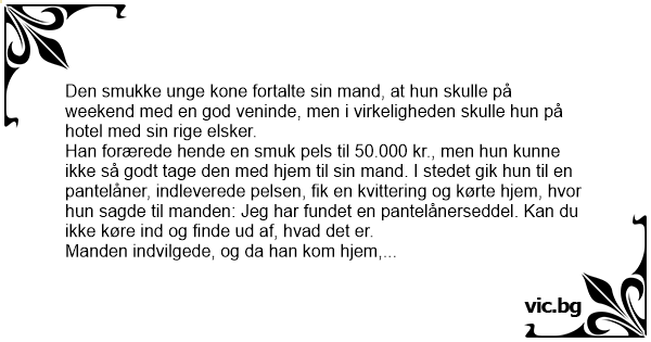Han forærede hende en smuk pels til 50.000 kr., men hun kunne ikke så godt tage den med hjem til sin mand. I stedet gik hun til en pantelåner, indleverede pelsen, fik en kvittering og kørte hjem, hvor hun sagde til manden: Jeg har fundet en pantelånerseddel. Kan du ikke køre ind og finde ud af, hvad det er.