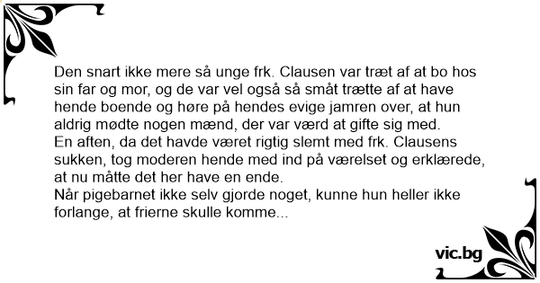 Den snart ikke mere så unge frk. Clausen var træt af at bo hos sin far og mor, og de var vel også så småt trætte af at have hende boende og høre på hendes evige jamren over, at hun aldrig mødte nogen mænd, der var værd at gifte sig med.
