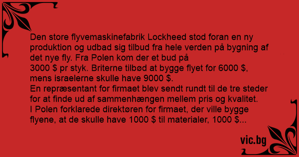 - Jo, svarede jøden, der er 3000 $ til dig, 3000 $ til mig og 3000 $ til de idioter i Polen, der skal bygge flyene.